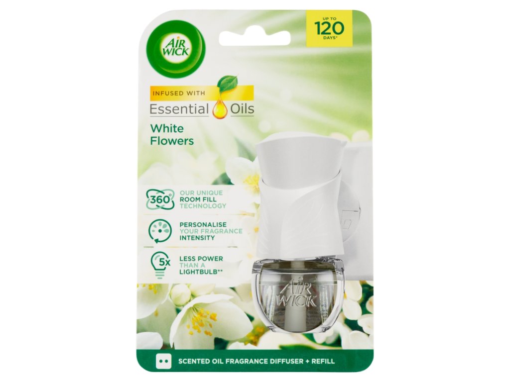Air Wick električni osvježivač zraka s bijelim cvijećem, punjenje od 19 ml, pruža topao i dugotrajan miris, traje do 100 dana, ovisno o odabranom intenzitetu.