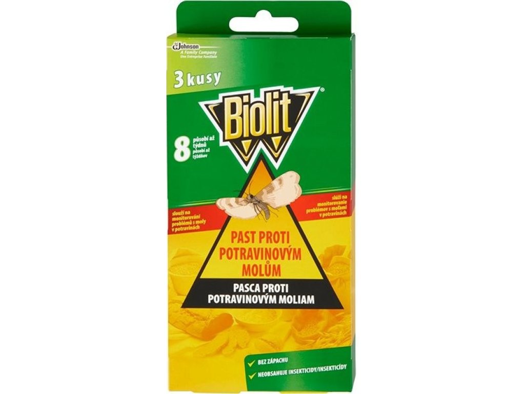 Klopka za prehrambene moljce učinkovito štiti hranu od četiri najčešće vrste prehrambenih moljaca. Sadrži kombinaciju unutarnje ljepljive površine i atraktanta (feromona) koji pouzdano privlači mužjake prehrambenih moljaca. Oni ostaju zalijepljeni za ljepljivu površinu. Hvatanje mužjaka sprječava razmnožavanje moljaca, a time i napad ličinki na hranu. Nakon uklanjanja zaštitne folije, učinkovitost je do 3 mjeseca. U pakiranju se nalaze 3 komada.