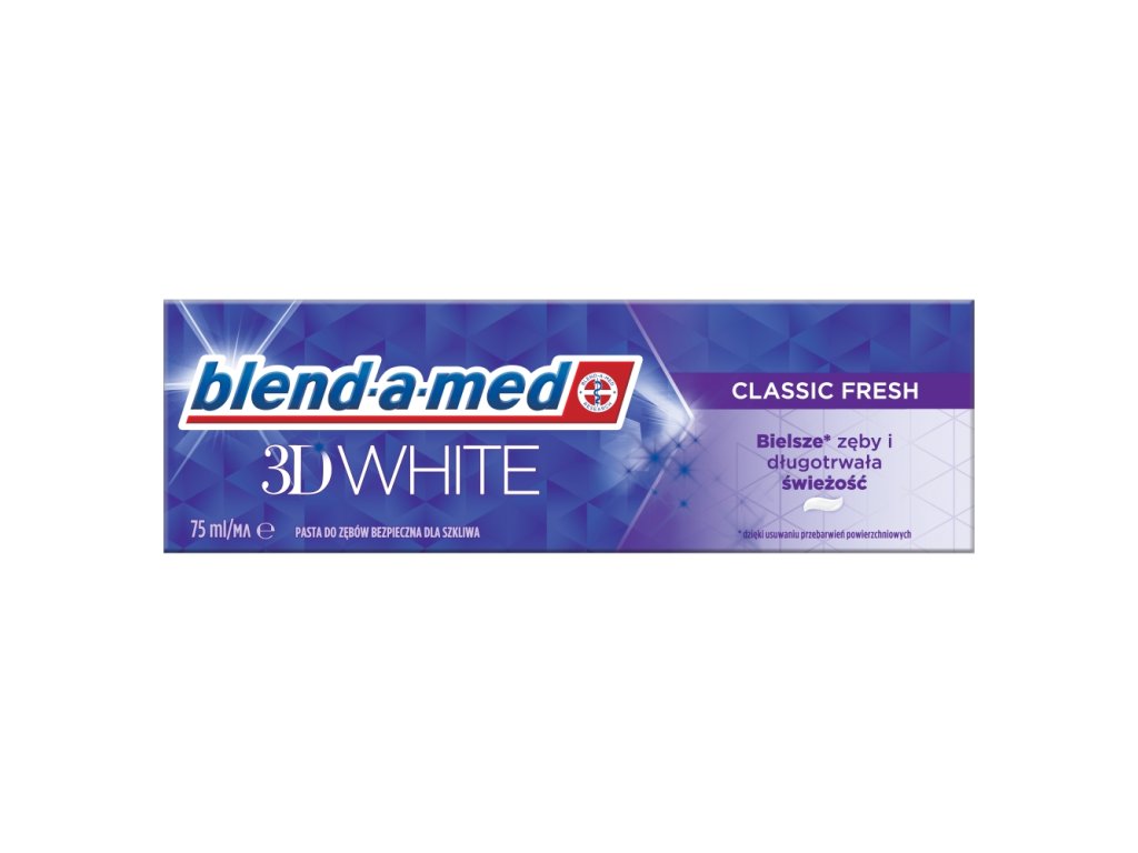 Blend-A-Med 3D White pasta za zube s učinkom izbjeljivanja vraća prirodnu bjelinu zubima, nježno uklanja žuti plak i mrlje tijekom redovitog pranja zubi te održava bjelinu zubi nakon čišćenja.
