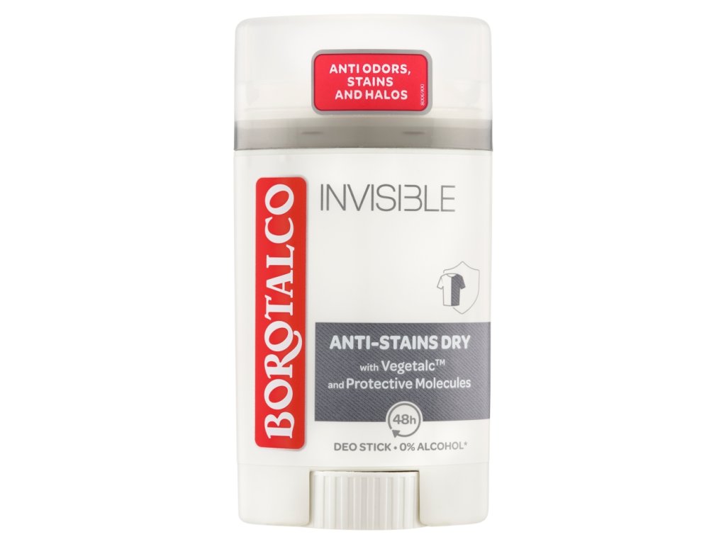 Borotalco Invisible posebno je razvijen za smanjenje pojave žutih mrlja na svijetlim tkaninama i bijelih tragova na tamnim tkaninama . Zahvaljujući sastavu s mikrotalkom, koji upija znoj, dezodorans regulira znojenje i osigurava suhu kožu svaki dan. Invisible Stick NE SADRŽI aluminijeve soli .