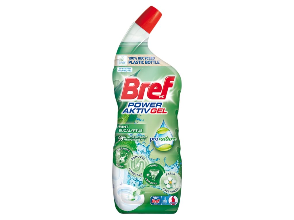 Za čist, sjajan i svjež WC. Bref ProNature aktivno čisti vaš WC zahvaljujući formuli protiv kamenca s 90% prirodnih sastojaka, pjenom za čišćenje i sredstvom za uklanjanje nečistoća. Također pruža miris mente i eukaliptusa inspiriran prirodom za ugodnije čišćenje i posebnu svježinu.
