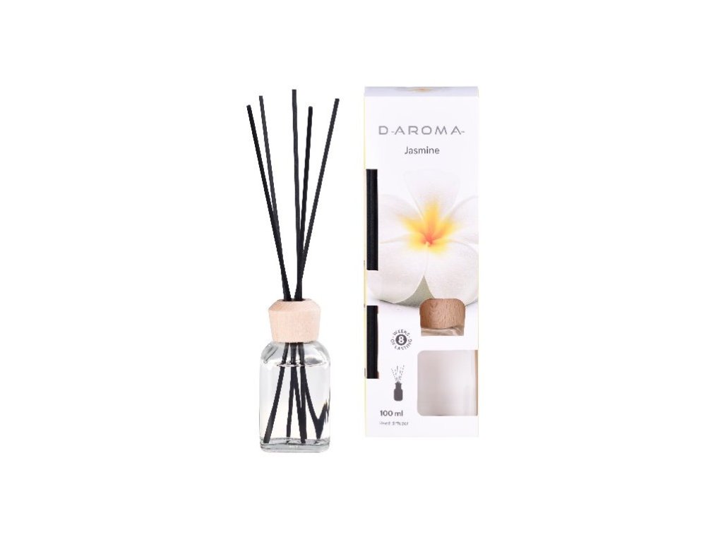 Elegantni mirisni difuzor D-Aroma s mirisom jasmina postat će omiljeni ukras u vašem domu. Neka vaš dom bude ispunjen nježnim mirisom jasmina koji će prekrasno namirisati vaš dom. Miris će se početi oslobađati nakon umetanja štapića u difuzor. Intenzitet mirisa možete prilagoditi brojem štapića u difuzoru. Mirisni difuzor je prikladan i kao poklon za vaše najmilije. Volumen 100ml. Vrijeme mirisanja do 6 tjedana.Dodatni parametri