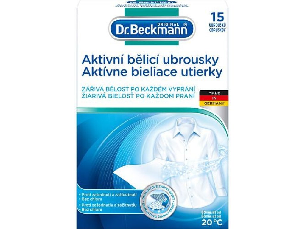 Dr. Beckmann aktivne maramice za izbjeljivanje pouzdano se bore protiv sivljenja i žutljenja te vraćaju odjeći sjajnu, blistavu bijelu boju. Sadrže idealnu kombinaciju optičkih izbjeljivača koji djeluju kao aktivator bijele boje te oživljavaju i povećavaju sjaj bijelog rublja sa svakim pranjem.