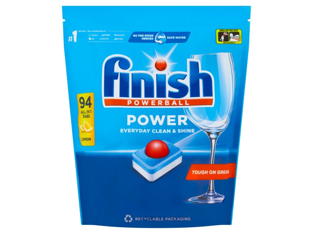 Finish All in 1 Lemon Sparkle tablete mogu se nositi sa svakim prljavim posuđem. Njihova učinkovita formula s Powerballom uklanja čak i zapečene ostatke hrane ili masnoće. Postižu uvjerljive rezultate već prvi put i zajamčeno vam je da će vaše posuđe biti savršeno čisto, sjajno i bez mrlja od vode.