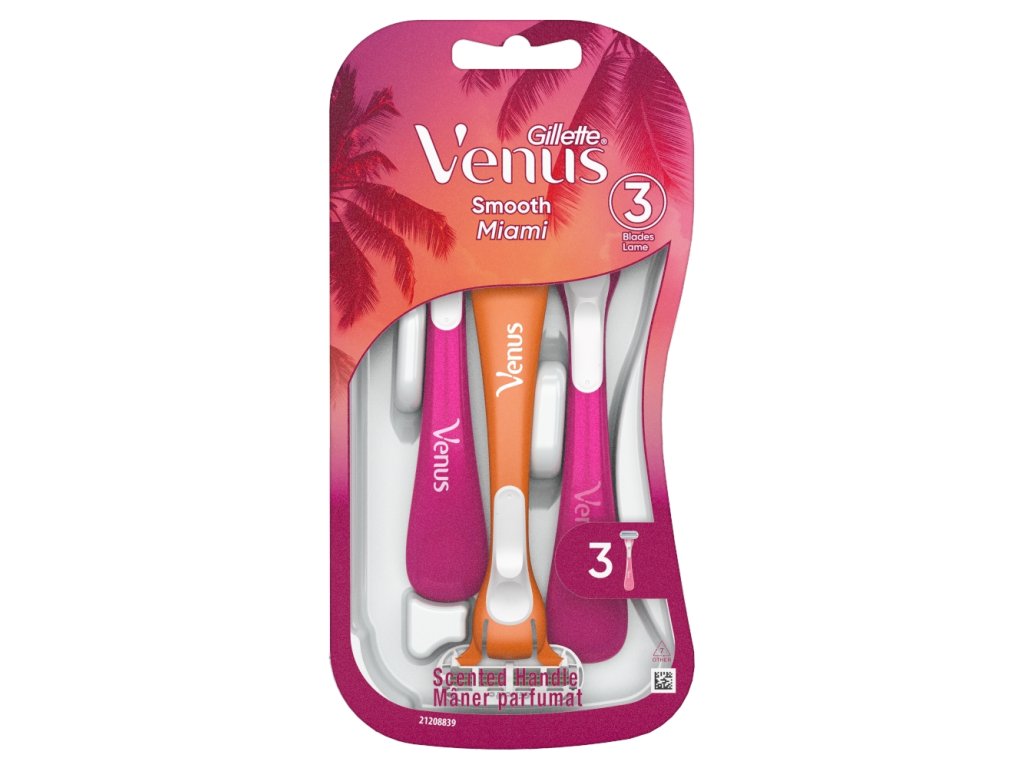 Ženske britvice Venus dizajnirane su imajući na umu žensko tijelo. Ženske britvice Venus Smooth Miami pružaju glatko i temeljito brijanje bez napora. Ove ženske britvice imaju 3 oštrice koje se prilagođavaju obliku tijela i okretnu glavu koja reagira čak i na najsuptilnije promjene u konturama tijela. S ergonomskom drškom s mekim hvatom koja udobno leži u ruci.