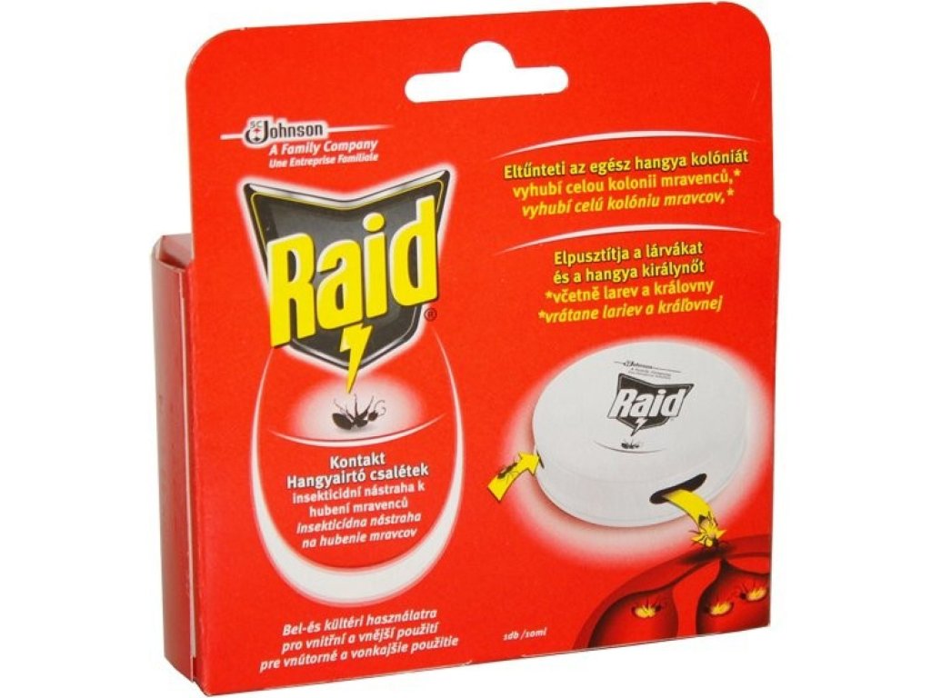 Insekticidni mamac za mrave Raid pruža vrlo učinkovitu zaštitu u kućama, stanovima ili na vanjskim terasama. Djeluje 24 sata. Mamac, koji radnici nose do gnijezda, uništit će cijelu koloniju, uključujući ličinke i maticu, unutar 2 tjedna. Mamac je učinkovit nekoliko tjedana. Za opsežnije zaraze mravima, koristite nekoliko mamaca istovremeno kako biste postigli učinak.