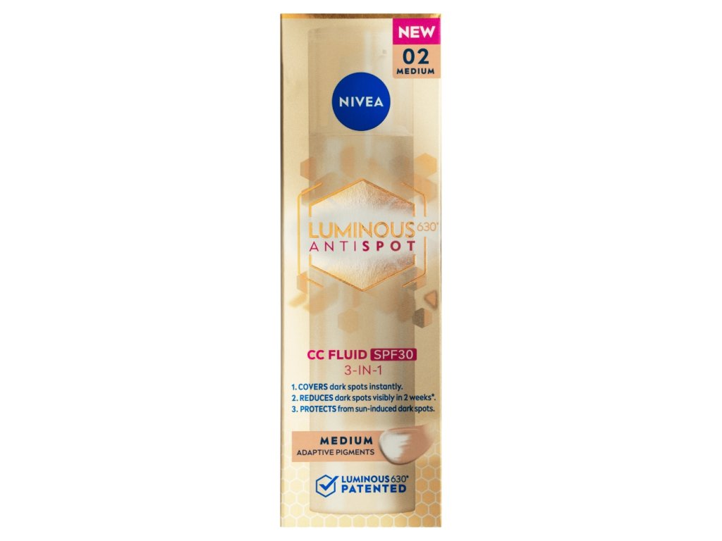 Blistava i prirodno ujednačena koža svaki dan? Isprobajte CC kremu LUMINOUS630®. Zahvaljujući SPF-u 30, idealan je partner za prekrivanje nesavršenosti kože i zaštitu od štetnih sunčevih zraka. Sadrži patentiranu tvar LUMINOUS630® koja smanjuje tamne mrlje i ujednačava ton kože. Pigmenti boje prilagođavaju se tenu kože i prekrivaju pigmentacijske mrlje, kao i druge nesavršenosti koje se pojavljuju na koži. Prekrijte nesavršenosti svoje kože, zaštitite je od sunčeve svjetlosti i istovremeno se riješite tamnih pigmentacijskih mrlja. Isprobajte NIVEA CC kremu 3u1.