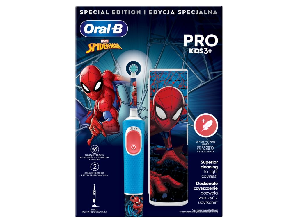 Oral-B Vitality Pro dječja četkica za zube Spiderman s putnom kutijom je posebno dizajnirana za djecu . Ova oscilirajuće-rotirajuća četkica za zube razvija 7600 vibracija u minuti . Četkica za zube je prikladna za djecu od tri godine .