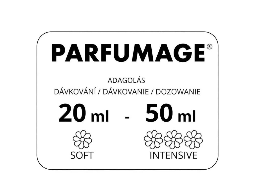 PARFUMAGE® parfem za rublje za intenzivan i dugotrajan miris rublja. Neutralizira ostatke deterdženta, oživljava boje i nježan je za kožu i perilicu rublja. Dodajte umjesto omekšivača u posljednjem ispiranju. Pogodno za sve vrste pranja do 95 °C.Dodatni parametri