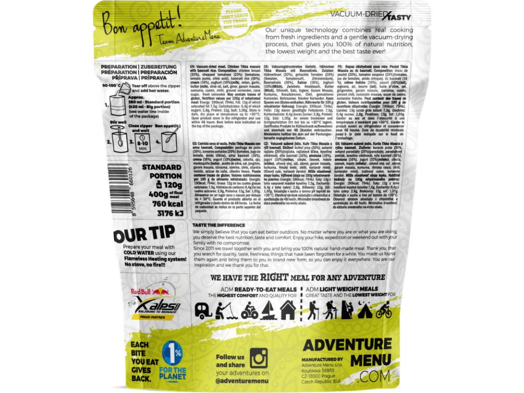Piletina Tikka Masala s basmati rižom popularna je indijska delicija pogodna za putovanja. Cijelo jelo prvo se priprema na tradicionalan način koristeći visokokvalitetne sastojke. Zatim slijedi jedinstvena tehnologija sušenja Vaccum-Dried Tasty®. Zahvaljujući tome, jelo zadržava svoj izvrstan okus i nutritivne vrijednosti. Istovremeno, štedi težinu do 80%. Dobiveni proizvod pakiran je u praktične vakuumske vrećice, zahvaljujući kojima sa sobom ne nosite nikakav dodatni zrak. Rezultat je ultra lagano jelo koje ćete koristiti uglavnom u pokretu. Cijenit ćete ga posebno u slučajevima kada želite sa sobom ponijeti hranjivu hranu, ali istovremeno uštedjeti prostor i svaki gram koji nosite na leđima. Savršeno je za planinarenje, kampiranje ili biciklističke izlete. Međutim, možete ga uživati i kod kuće kada nemate vremena za kuhanje.