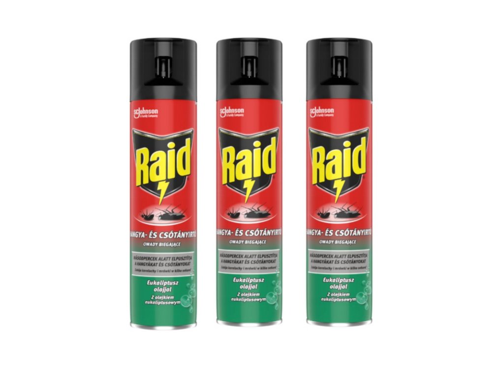 SC Johnson Raid insekticid u spreju namijenjen je učinkovitom suzbijanju puzećih insekata u domu i oko njega. Djeluje brzo i pomaže u uklanjanju žohara, mrava, pauka ili bubamara, uključujući i njihova jajašca. Sprej se može koristiti izravno na insekte ili na mjestima gdje se skrivaju i kreću, poput pukotina, kutova soba ili oko cijevi. Proizvod ima ugodan miris s uljem eukaliptusa i prikladan je za unutarnju i vanjsku upotrebu.