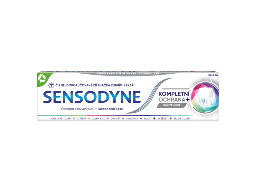 Sensodyne Complete Protection Whitening ublažava bol osjetljivih zubi za 60 sekundi. Sensodyne pasta za zube s brzim početkom djelovanja pruža klinički dokazano olakšanje od boli osjetljivih zubi. Kositreni fluorid obnavlja zaštitni sloj na izloženom dentinu.