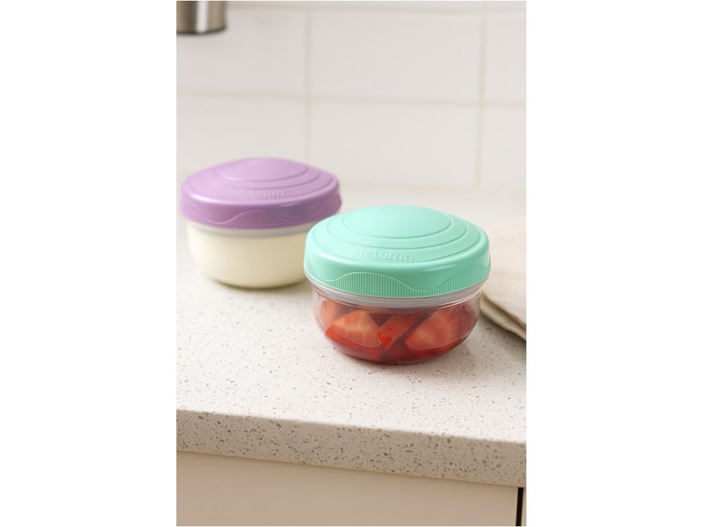 Praktične Sistema čašice od 150 ml, dostupne u setu od dvije, savršene su za sigurno nošenje manjih porcija voća, salate, umaka ili drugih poslastica. Čašice su prikladan dodatak klasičnim kutijama za grickalice. Prednosti: • Poklopac na vijak se lako otvara, savršeno se zatvara • Mogu se slagatiDodatni parametri