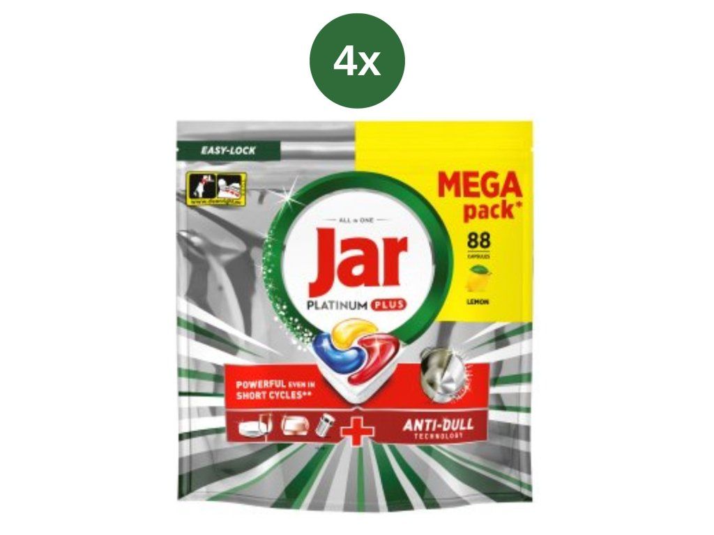 Jar Platinum Plus MEGA su visoko učinkovite višenamjenske kapsule za perilicu posuđa koje osiguravaju savršene rezultate čak i na jako zaprljanom posuđu. Zahvaljujući naprednoj kombinaciji sastojaka u obliku gela i praha, učinkovito uklanjaju masnoću, osušene ostatke hrane i drugu tvrdokornu prljavštinu bez potrebe za prethodnim pranjem.