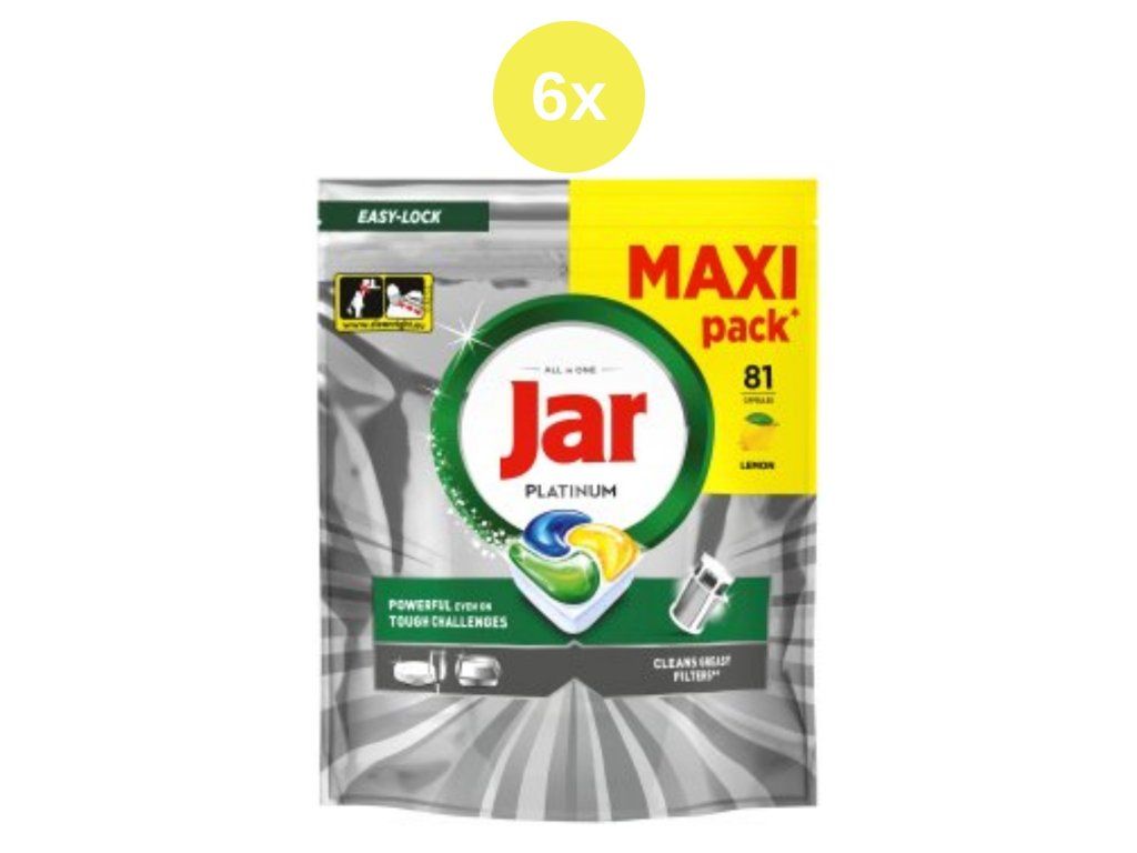 Jar Platinum MAXI su višenamjenske kapsule za perilicu posuđa koje pružaju visoku učinkovitost čišćenja čak i na jako zaprljanom posuđu. Zahvaljujući kombinaciji sastojaka gela i praha, učinkovito uklanjaju masnoću, osušene ostatke hrane i tvrdokornu prljavštinu, ostavljajući posuđe savršeno čistim i sjajnim.