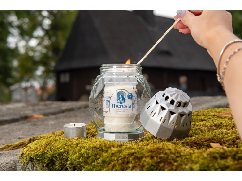 Lijevana depozitna svijeća Theresia u bijeloj boji, gori do 2 dana.