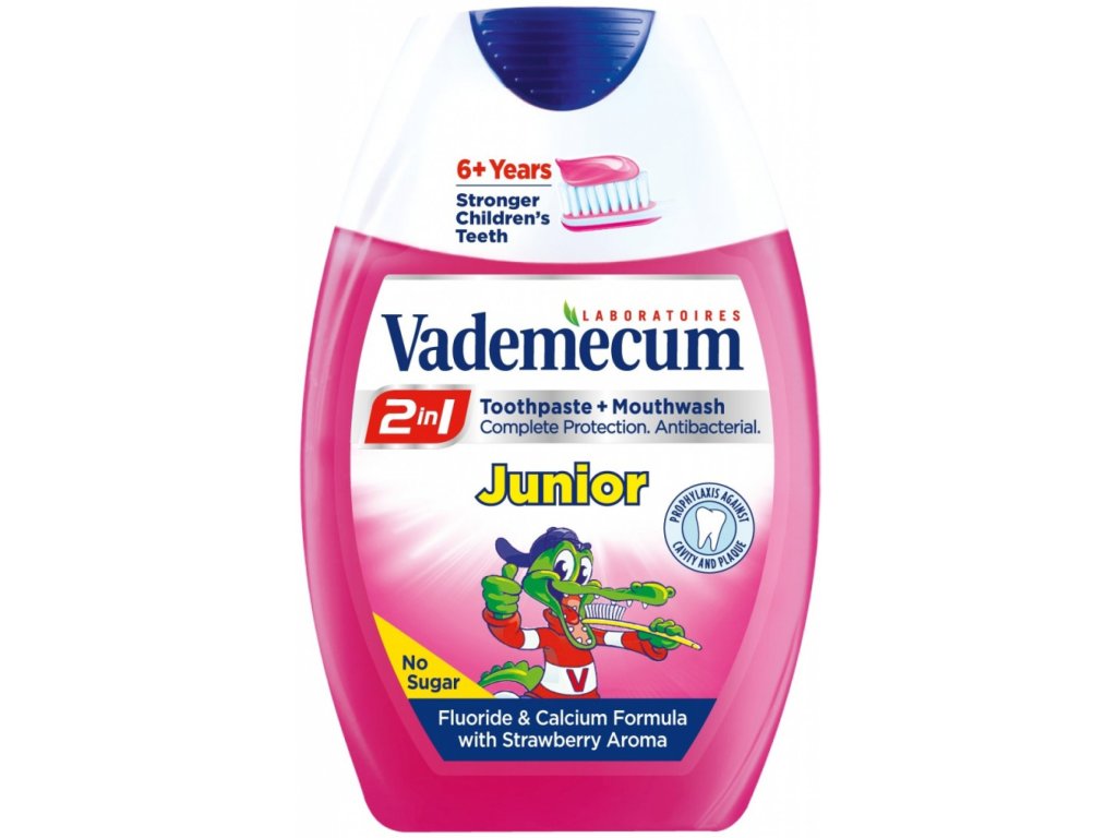 Vademecum 2u1 Junior pasta za zube i vodica za ispiranje usta za potpunu zaštitu od karijesa, plaka, kamenca i problema s desnima. Posebno razvijena za djecu od 6 godina.