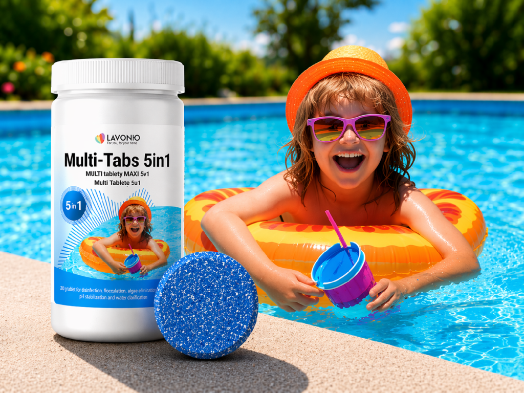 Multifunkcionalne tablete 5u1 osiguravaju potpunu njegu vode u bazenu. Polako se otapaju 5–10 dana, bez kalcija – ne mutno vodu niti povećavaju tvrdoću. Pogodne za bazene s folijom i plastične bazene do 30 m³.